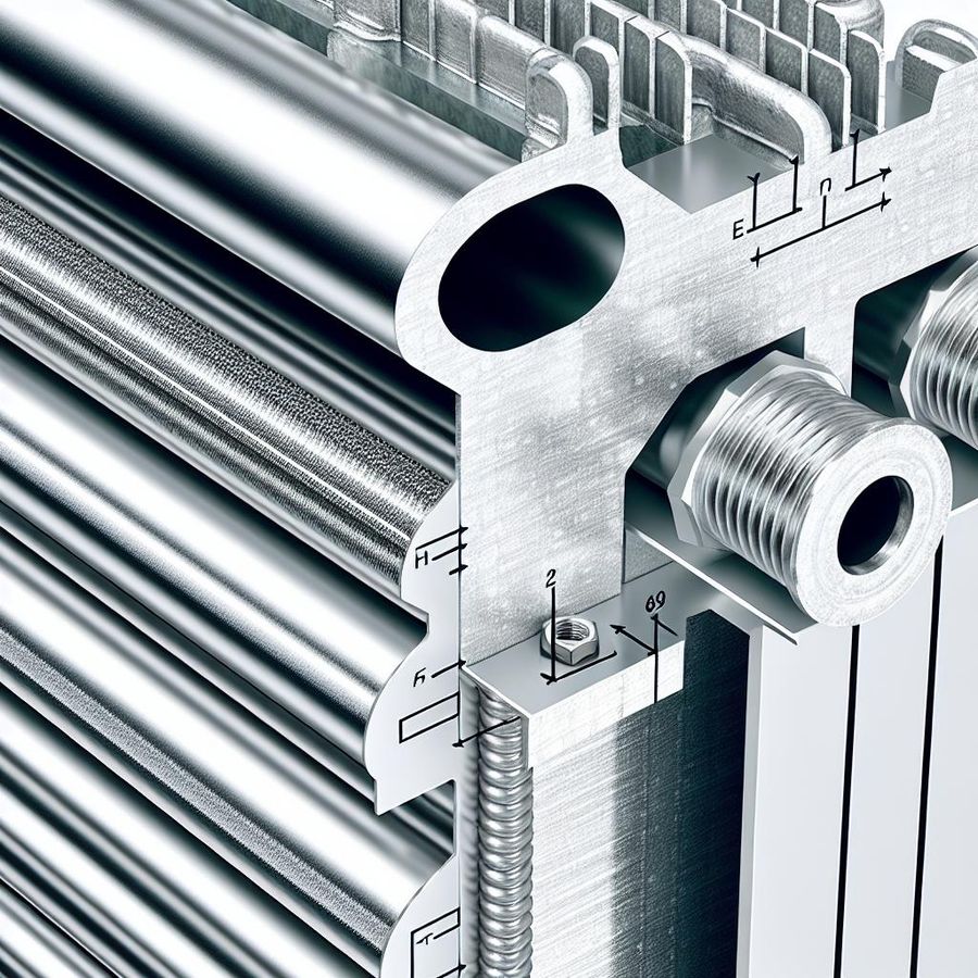 Структура биметаллического радиатора включает в себя внутренний стальной сердечник и наружную алюминиевую оболочку. В центре расположены вертикальные и горизонтальные стальные трубки, по которым циркулирует теплоноситель. Эти элементы играют ключевую роль в выдерживании давления и препятствуют коррозии. Затем стальная конструкция покрывается слоем алюминия, который обеспечивает равномерное распределение тепла.